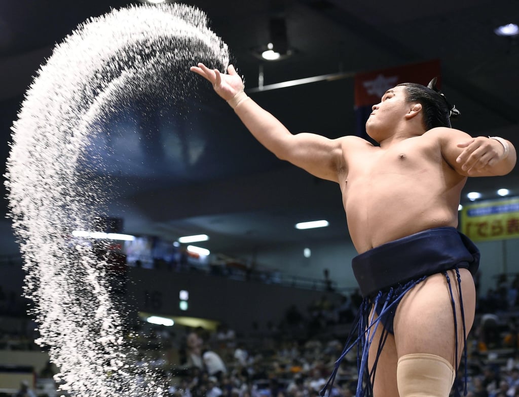 一名相扑选手在日本中部名古屋的比赛中向空中撒盐。照片:共同社/美联社