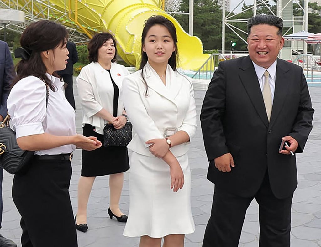 金正恩(右)、他的妻子李雪珠(左)和他们的女儿周爱(中)于六月二十四日访问北朝鲜江原道的元山卡尔马海滨旅游区。照片:KCNA/AFP