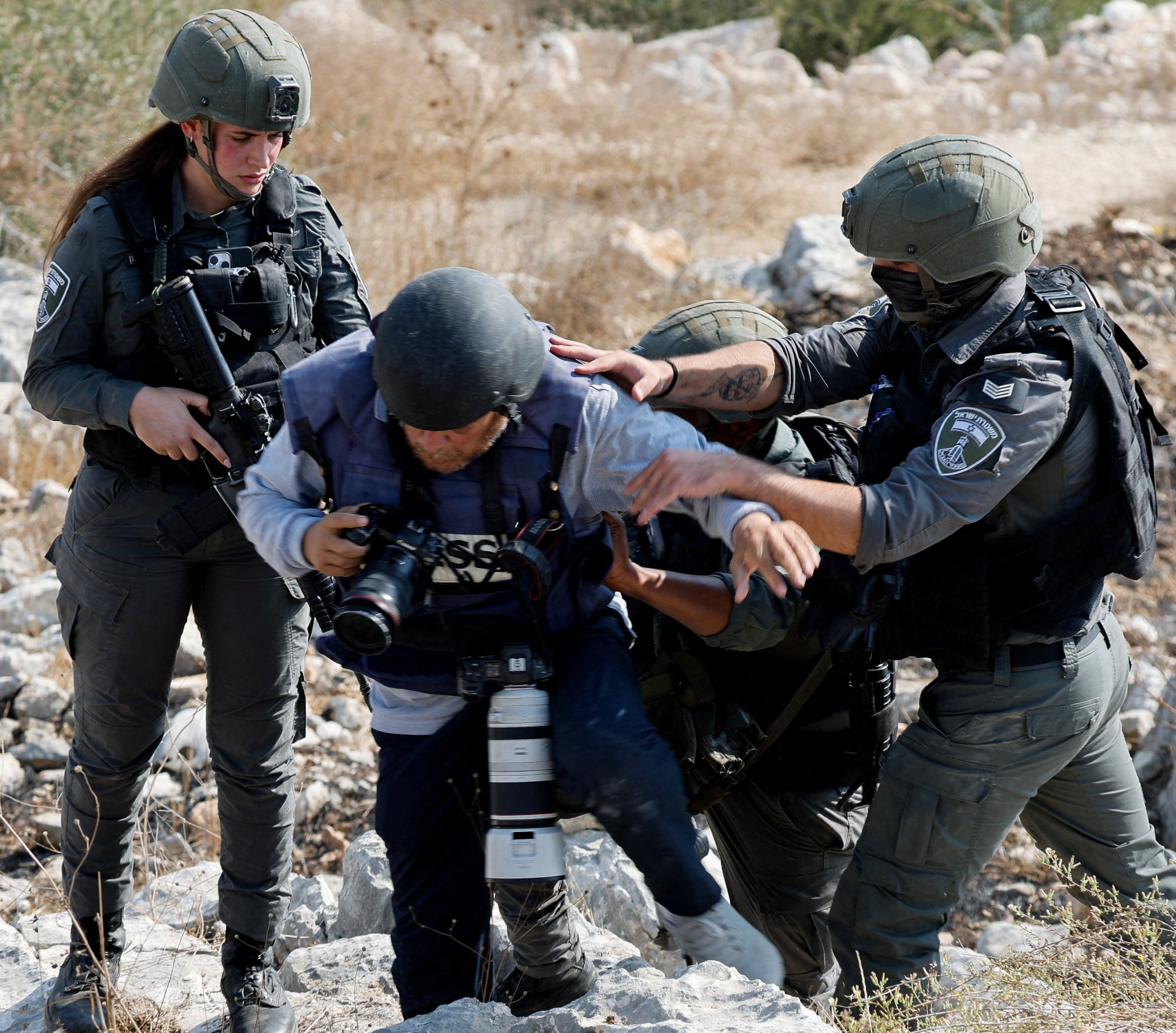 以色列士兵在周五将一名摄影师从与巴勒斯坦抗议者冲突的现场带走。照片:路透社